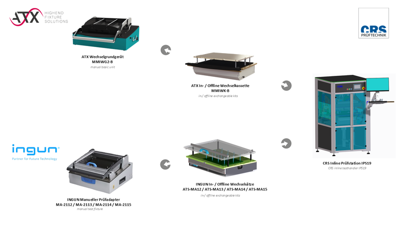 Seit dem Jahr 2017 bieten wir unseren Kunden die Möglichkeit ihre INGUN Wechselsätze in unseren Inline-Prüf-Stationen zu verwenden. Über die Jahre hinweg hat sich ein Portfolio entwickelt, dass inzwischen die Wechselsätze ATS MA12 / ATS- MA13 / ATS-MA14 und seit neuestem auch den ATS-MA15 umfasst. Ein Prüfadapter für In- und Offline über die gesamte Produktlebenszeit – schnell, kosteneffizient und einfach!